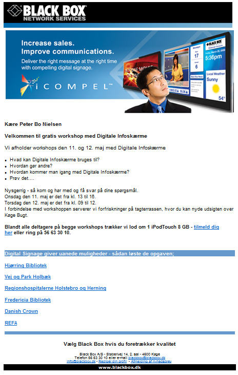 Nyhedsbreve LandingspageFå nyheder fra Black Box direkte i din indbakkeVi udsender ca. hver 14 dag et nyhedbrev på email med spændende produkter og teknologier, med tekniske tips og triks og med gode tilbud på interessante produkter. Få dine nyheder direkte i indbakken ved at tilmelde dig nyhedsbrevet her.